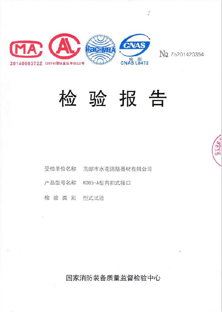 I plant was founded in June 1976, the existing staff of 600 people,including all kinds of technical and management staff of 68 people.With 50 millon yuan in fixed assets,covers an area of over 35,000 square meters,construction area of over 25,000 square meters.The establishment of a sound quality system. made a variety of "measurement of qualified certification",and become Jiangsu and more provinces of the fire association member units.Factory strong technical force,production and testing equipment,advanced technology.Production "water flower"brand water with intertace:KDK65,KD65,KY65,KN65.Fire water gun:QZG3.5/7.5,QZ3.5/7.5,QP8/0.7Z foam water gun.Indoor fire hydrant:SN65,SNW65-1,SNZ65,SNZW65-1.Fire hose reel JPS0.8-19/25.Production of "postal" card,fire with lining water:65-8,10,13.16,20,25 type;80-16,20,25 type.Water interface:KD50,65;KY50,65;KN65.Fire water gun:QZ3.5/7.5.5.Indoor fire hydrant:SN65,SNW65-1,SNZ65,SNZW65-I.And in May 2015 through the Ministry of Public Security Fire Product Conformity Assessment Center 3C version of the inspection access to all of the above products,mandatory certification,to allow the production and marketing,product marketing throughout the country,praised by the majority of users.
